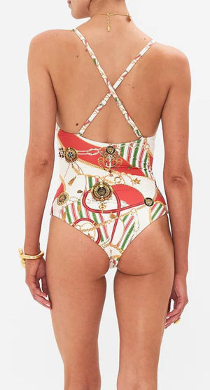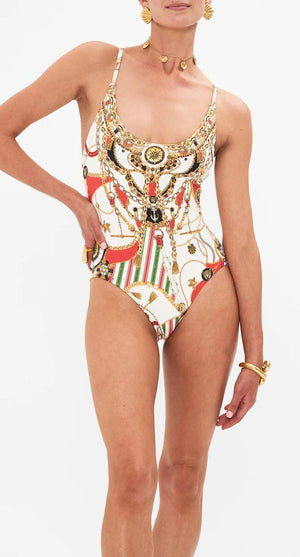 Indulge in exclusive luxury this summer wearing the Camilla Saluti Summertime Scoop Neck One Piece with Buttons. Crafted from regenerated nylon, this chic one piece is hand-embellished with shimmering CAMILLA crystals and self-covered buttons for a lavish, luxurious touch. With adjustable and convertible high-rise lines, the timelessly elegant style beautifully elongates the legs for a svelt silhouette. Boast exquisite style in Italian-inspired sophistication.