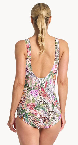 Experience comfort and confidence with the Lilymaze Pintuck One Piece Swimsuit in Skin. Designed with mastectomy pockets and soft fixed cups, it provides gentle support and a flattering round bust shape. The elastic shelf bra and wide shoulder straps ensure all-day comfort, ideal for B-D cup sizes. Featuring a beautiful scoop neckline, mid scoop backline, and low boyleg fit, this swimsuit offers full coverage with a figure-hugging powermesh front and pintuck detail that smooths and flatters. Crafted from durable nylon and Extra Life Lycra, its animal floral print adds a stylish touch to your swimwear collection.