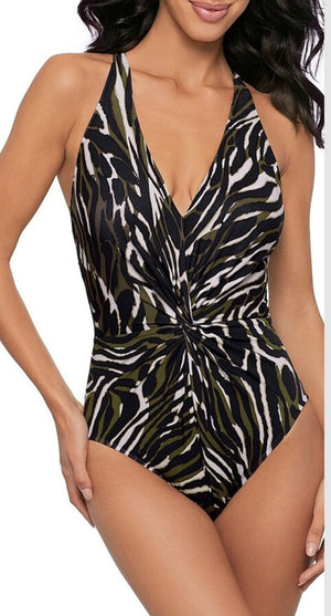 Safari Sands Drew One Piece offers reliable support with its wireless bra design that accommodates up to a D-cup, complete with removable soft cup padding. The flattering twist front and V-neckline enhance your silhouette, while allover slimming control provides confidence at the beach or pool. Featuring fixed straps and a stylish strappy back detail, this one-piece combines comfort and elegance with its moderate leg cut.