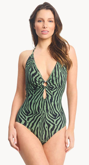 The Zena Double Ring One Piece in Black offers a flattering fit with its adjustable halterneck tie and plunging neckline. Designed for B-D cup sizes, it features moulded cups for a rounded shape and a seamless neckline for a smooth finish. The centre front and low back ring details add stylish touches, while the regular legline provides medium coverage. This swimsuit combines comfort and elegance, making it a supportive choice for your swimwear collection.
