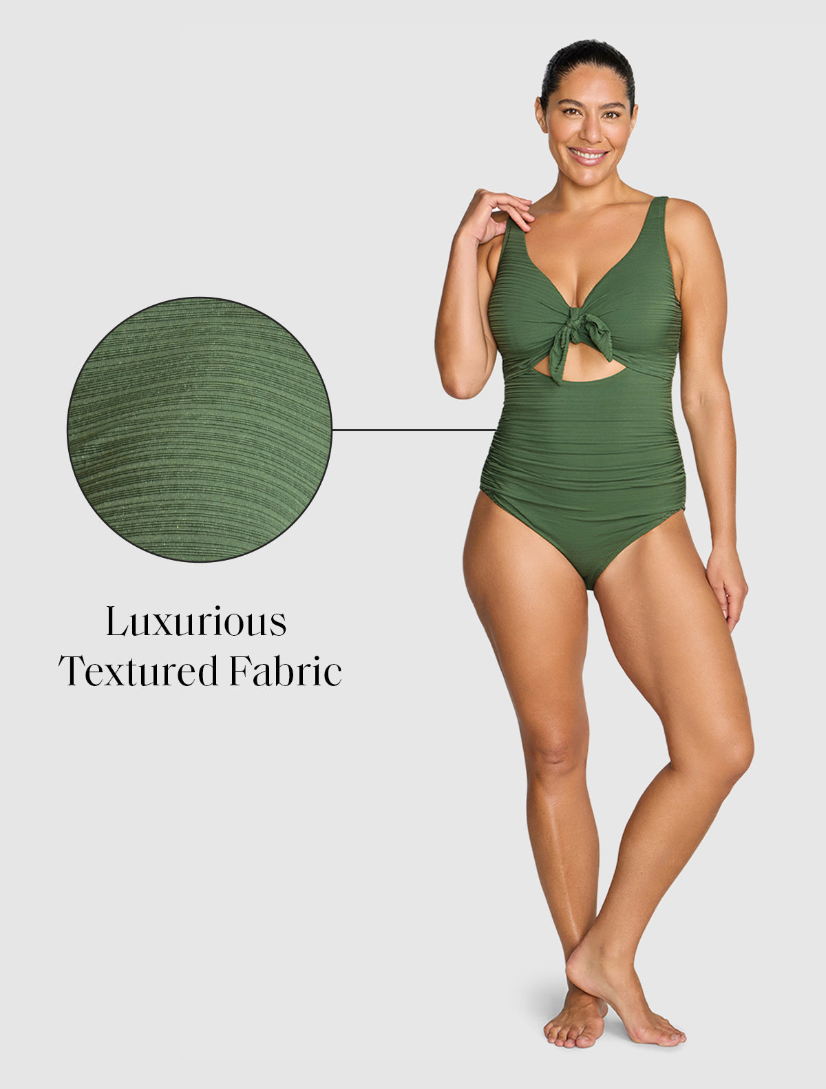 Artesands fits your curves. Make a curve statement in our Artesands Cezanne plus size one piece, the most flattering swimsuit shape EVER. Our Cezanne one piece has a mock knot tie at the front that covers a full internal cup support system. Our Cezanne shape is an underwire style with full foam cups that create great bust shape for a D cup, DD cup and E cup. But it is the peep hole on this style that creates the most amazing figure flattering illusion. The peephole creates a body enhancing hourglass shape and when paired back with our full body 360 degree powermesh and our front panel ruching this style is truly flattering. Cezanne has good moderate bottom coverage.