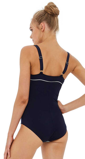 This nautical inspired Drifter E-F cup one piece with underwire is perfect for supporting our fuller bust ladies. With flattering front ruching panel to soften the tummy area, wider adjustable straps for comfort and fit, high back for a smooth line + long wearing fabric!