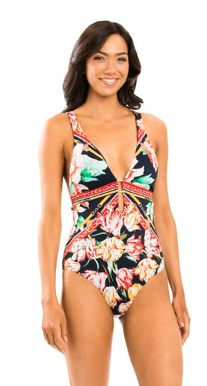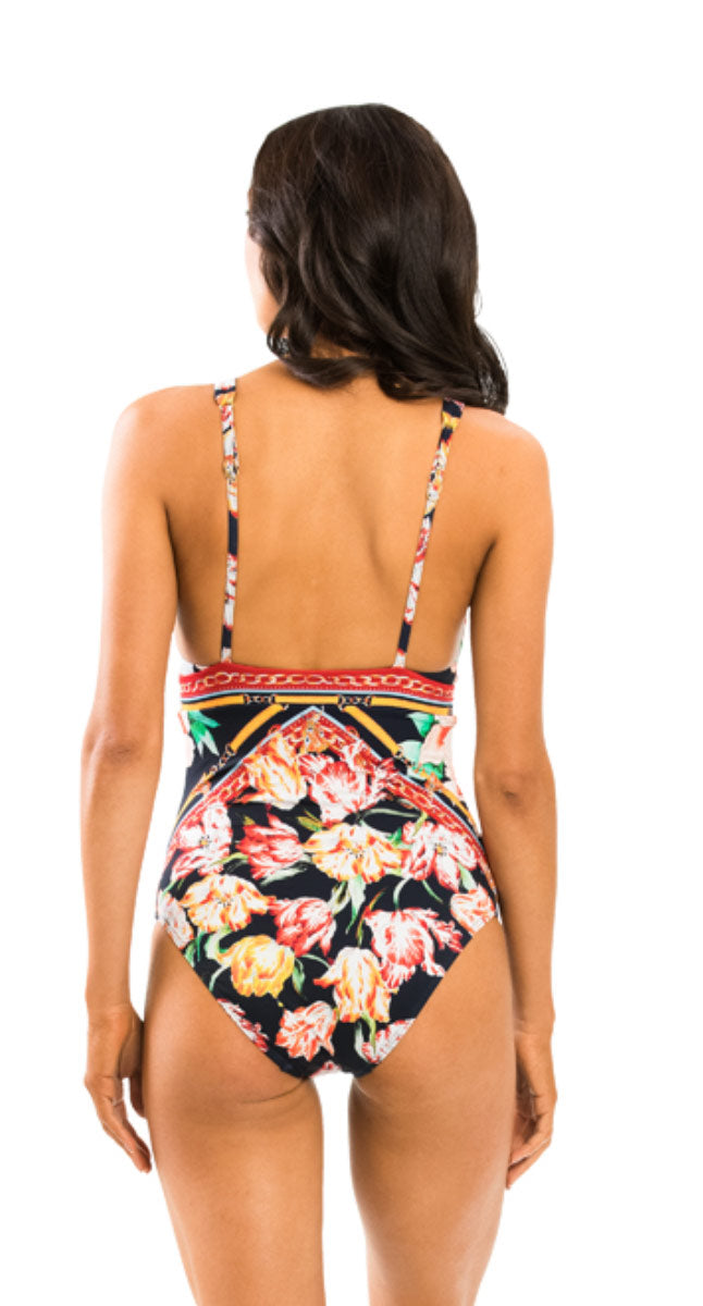 Welcome to Galleria. This stunner features plunge V neckline with gold hard wear, placement print detail, removable soft cups to shape the bust and adjustable straps for a customised fit.