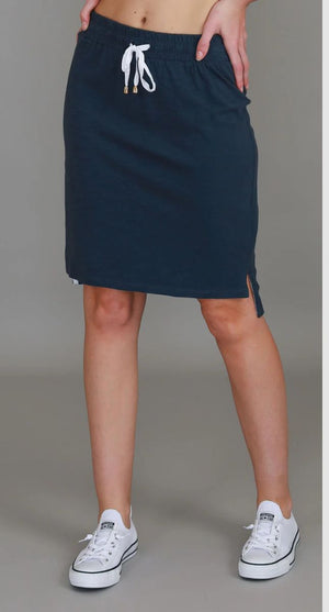 The Alice Skirt offers comfortable everyday style with its soft cotton jersey fabric featuring a subtle slub texture. The elastic waistband with adjustable drawstring ensures a perfect fit, while the flattering hi-lo hemline adds a touch of elegance. Falling to an above-knee length, this true-to-size skirt is perfect for holiday packing or just everyday fun!