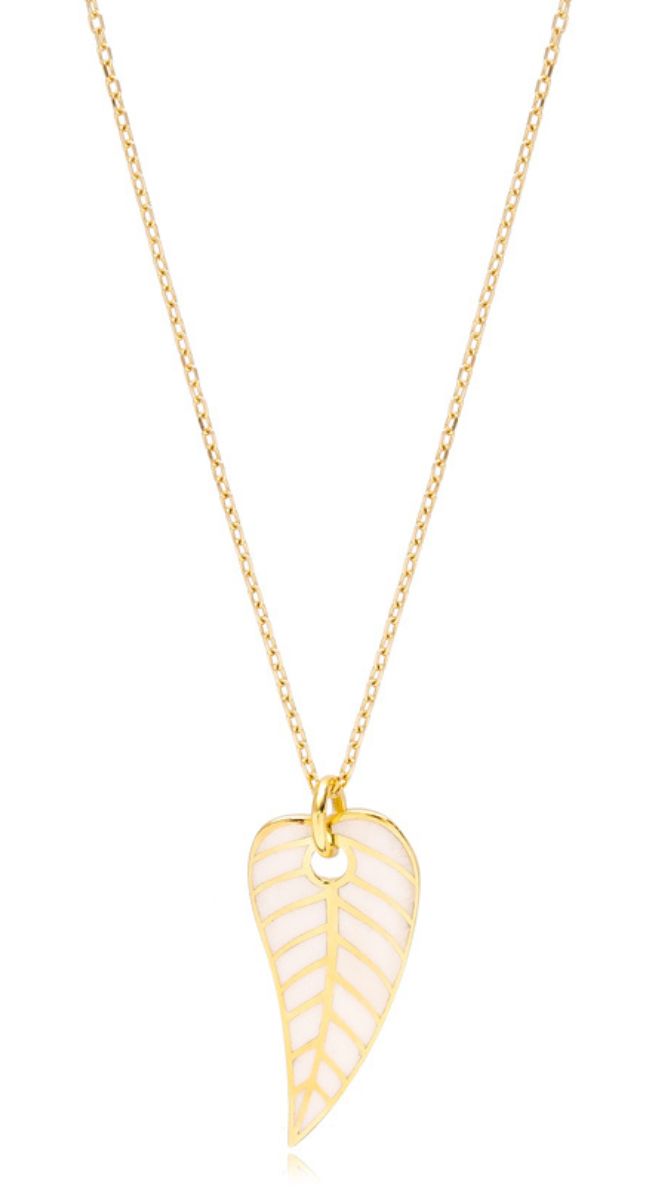This stunning necklace is made from sterling silver and coated in yellow gold featuring a white enamel leaf pendant.
