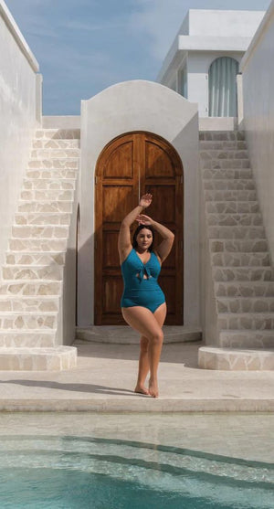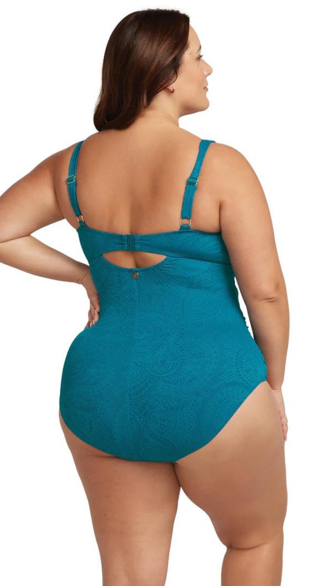Artesands fits your curves. Make a curve statement in our Artesands Cezanne plus size one piece, the most flattering swimsuit shape EVER. Our Cezanne one piece has a mock knot tie at the front that covers a full internal cup support system. Our Cezanne shape is an underwire style with full foam cups that create great bust shape for a D cup, DD cup and E cup. But it is the peep hole on this style that creates the most amazing figure flattering illusion. The peephole creates a body enhancing hourglass shape and when paired back with our full body 360 degree powermesh and our front panel ruching this style is truly flattering. Cezanne has good moderate bottom coverage.