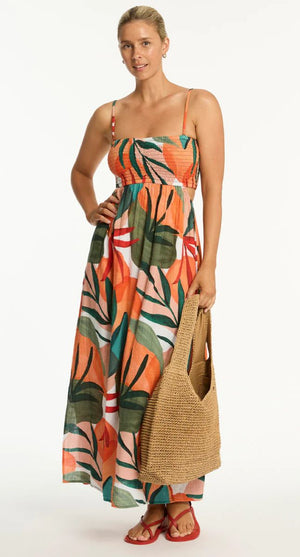Experience the Tropaluxe Cutaway Bandeau Dress, designed with soft cotton cheesecloth for a gentle touch against your skin. Its shirred bodice and adjustable, removable straps ensure a comfortable, customizable fit. Featuring elegant cutaway details on the sides and back, this dress blends body-moulding style with breathable comfort. Inspired by tropical palms and botanical hues, it’s perfect for embracing warm, relaxed days with effortless style.