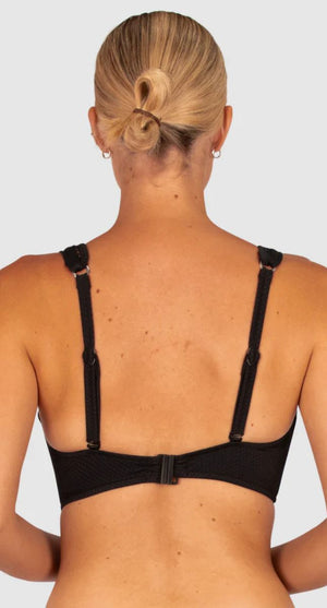 Baku's Rococco D-DD Longline Bikini Bra combines elegant design with supportive features for a confident fit. Its dropped neckline is beautifully accented with ladder lace detailing, while removable cups, lycra cup support, and boning ensure comfort and shape. Adjustable, convertible straps and a clip-back fastening offer customizable wear. Crafted from a soft, textural fabric blend developed in Spain and designed in Australia, this bikini bra delivers both style and reliable support for D-DD sizes.
