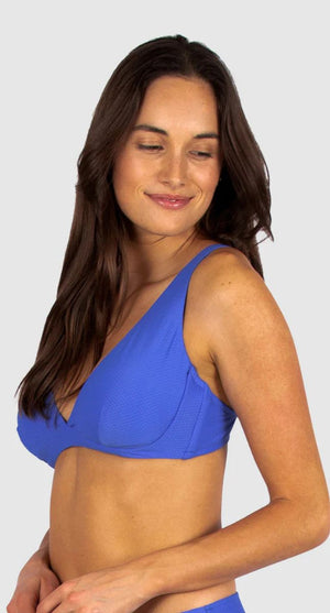 Crafted from exclusive Spanish textural fabric, the Baku Rococco D-E Cup Underwire Bikini Bra Top offers triangle shaped support and elegance. Featuring soft removable cups, underwire, and side boning, it sculpts and elevates your silhouette with comfort. Adjustable and convertible straps and a soft tie-back ensure a personalized fit - perfect for upsizing if you need a wider cup.