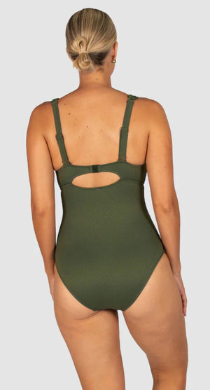 Baku's Rococco E-F Ladder Lace One Piece swimsuit combines elegance with support, designed for the modern woman. Crafted from buttery soft yet structured fabric, it offers flattering shaping and tummy control with power mesh. Featuring a dropped neckline with delicate ladder lace, underwire and boning support, removable cups, and a clip-back closure, this swimsuit ensures confidence and comfort. Made from high-quality textural fabric developed in Spain and designed in Australia, it’s perfect for a sophisticated, secure fit.