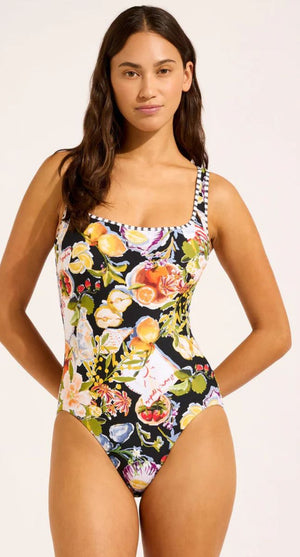 Make a splash this summer in the Riviera Coast DD One Piece, where style meets serious support. Featuring underwire and an internal shelf bra, your bust gets the lift and security it deserves. Hidden mesh layering adds extra reinforcement without the bulk, while contrast binding adds a chic edge. The regular legline flatters your silhouette beautifully, and the fun riviera-inspired print brings that carefree coastal vibe to every poolside moment. Dive into summer confidence.