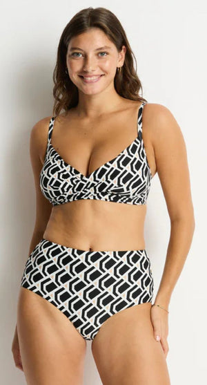 Elevate your swimwear with the Costa Multifit Bikini Top, where modern design meets conscious luxury. Featuring a striking black and white geometric print with refined gold hardware, this piece delivers a bold yet timeless resort look.