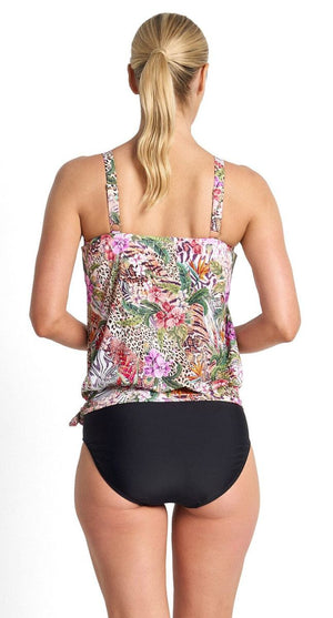 Experience effortless style and comfort with the Lilymaze Bandeau Blouson Singlet in Skin. Featuring fixed soft bra cups and a floating powernet shelf bra with elastic edge, it offers gentle support and shape. The elastic bandeau neckline and adjustable straps ensure a perfect fit, while the loose blouson silhouette flatters your figure by providing relaxed coverage over the tummy. Adorned with a beautiful floral and animal print, this top-only singlet brings a fresh, fun vibe to your wardrobe. Perfect for a chic, comfortable look that moves with you.
