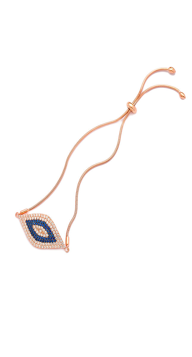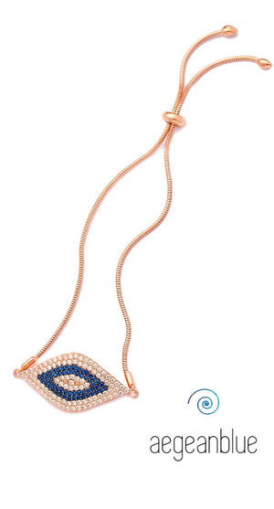 Aegeanblue Olympia bracelet. Inspired by the calm and relaxing luminous turquoise blue water of Ornos Beach. This bracelet is sensational by the sea. Stamped 925 sterling silver rose gold plated featuring the centre eye set with sparkling clear and the deepest of blue crystals- the eye measuring 3cm in length, a snake chain completes this bracelet. |