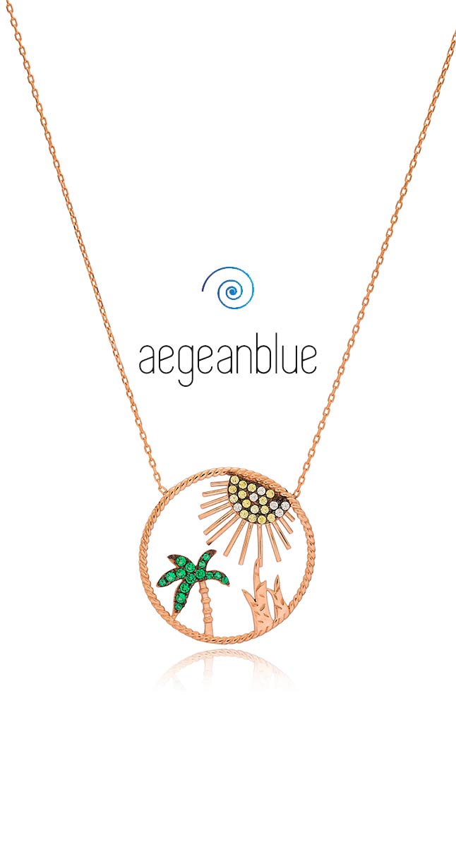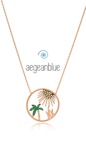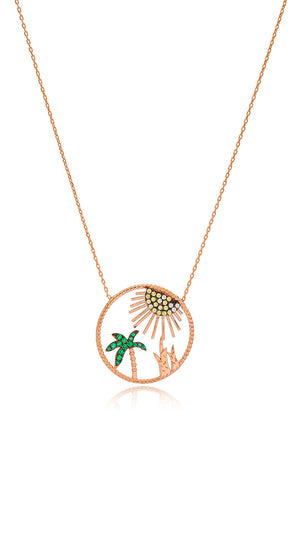 Perfect necklace to wear while listening to music, enjoying cocktails or taking refreshing dives into the turquoise waters of Mykonos, let the beautiful Mediterranean sun, do the dance of light on it through out the day. Stamped 925 sterling silver rose gold-plated . Cut out disk 3cm with a rope edge featuring cut outs of ever green crystals claw set into a palm tree , a sun filled with crystal clear claw set crystals and rays of rose gold plated metal beaming down. Suspended from a 45cm cable chain including an extension piece of 5cm.