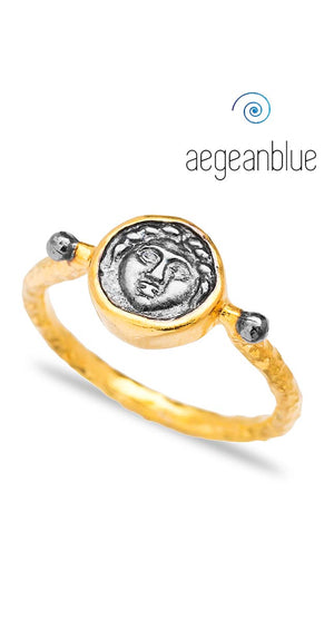 A beautiful ancient element- this ring is very comfortable to wear and can be stacked with your other favourite Aegeanblue rings, wear day to night, you will never want to take it off. Stamped 925 sterling silver yellow gold-plated hammer band featuring a vintage medallion bezel set and oxidised.