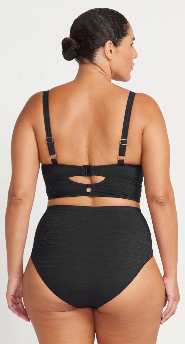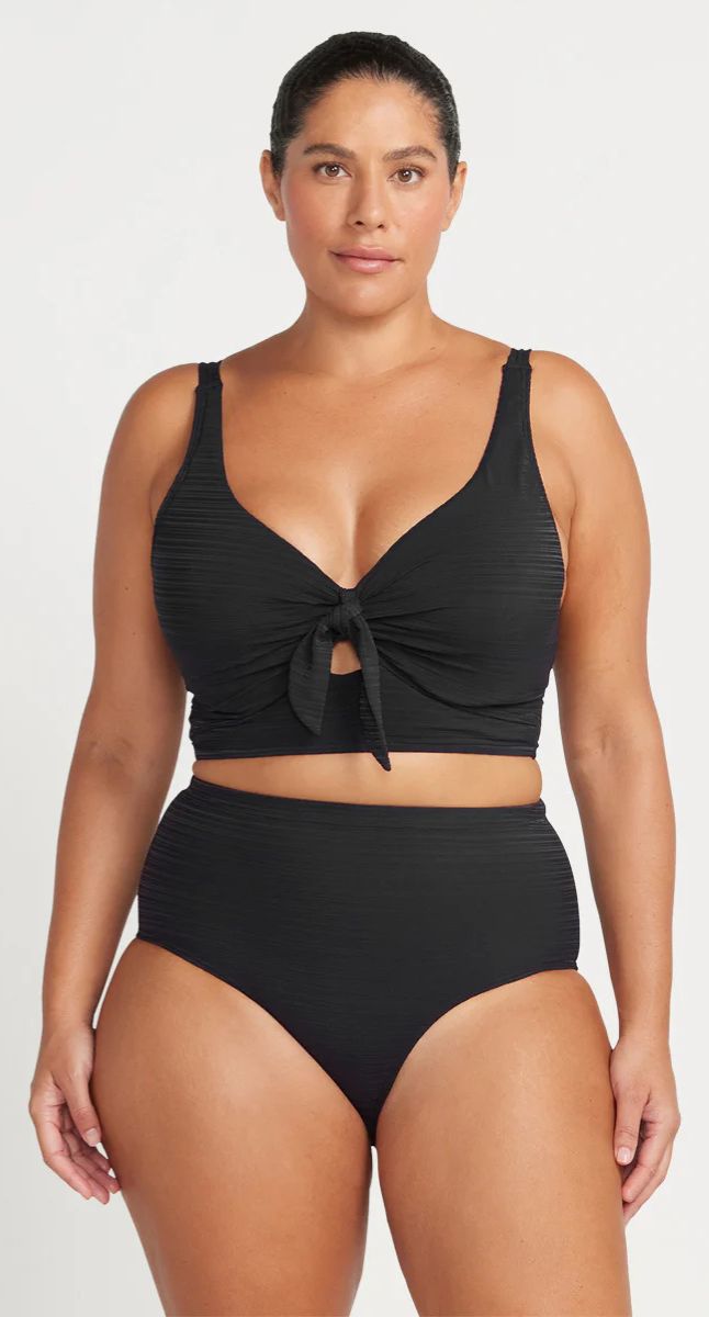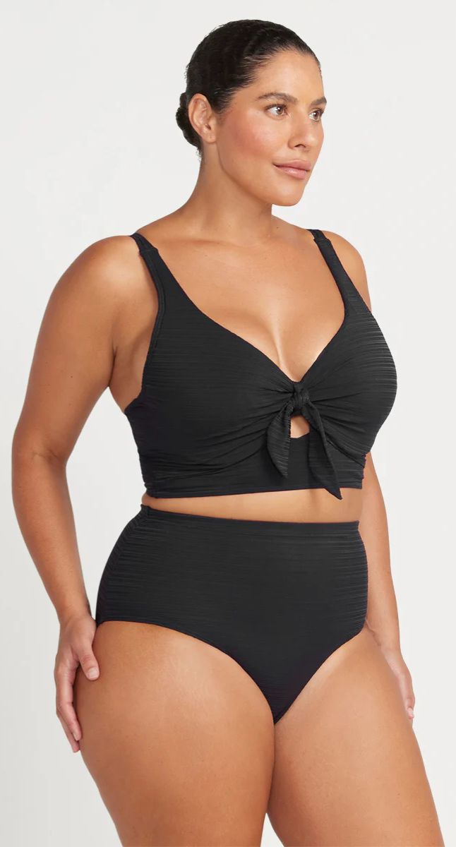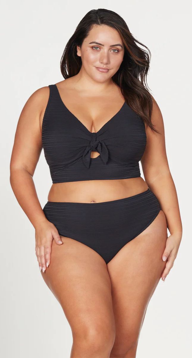 The Aria Cezanne Bikini Top is designed to celebrate and enhance your natural curves. Featuring a supportive underwire and full foam cups, it shapes and lifts from D to E cup sizes for a flattering fit. The mock knot tie and unique peep hole detail create an elegant hourglass illusion, highlighting your figure beautifully. Pair it with our curve-fit swim pants for a confident, comfortable look that embraces your shape with style and support.