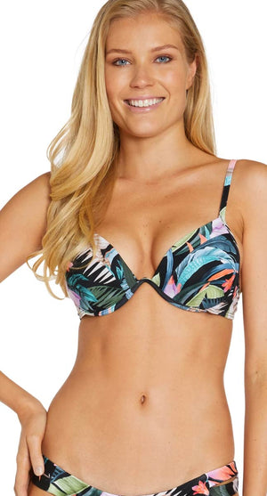 Welcome to Borneo, enjoy the lush tropical print and dream of exotic places! The bestselling booster bikini top features removable booster pads to lift the bust, moulded underwire cups, adjustable & convertible straps for a customised fit, secure clip back. Best for A-C cup sizes.