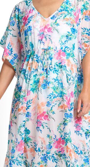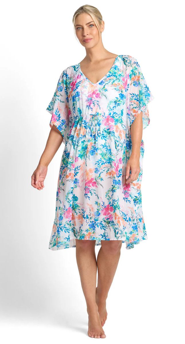 The loose, oversized silhouette drapes softly over swimwear, while the drawstring tie under the bust with metal detailing allows you to gently shape the fit. A bound V-neckline and relaxed drop shoulders enhance the laid-back aesthetic, making it the perfect layering piece for sun-soaked escapes.