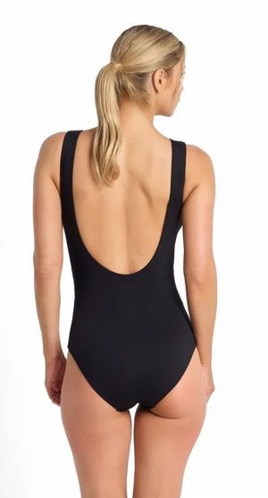 The Heritage Classics Sash Surplice One Piece is your new go-to for effortless elegance. Featuring strategic Powernet fabric across the front, this beauty smooths and flatters while the removable soft bra cups and elastic shelf bra keep you supported all day. Love the details? The crossover wrap front, soft side ties, and contrast panels add personality, while the mid-scoop back and seamless neck edge ensure comfort that doesn't quit. Regular pant cut, serious style—no compromises.