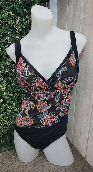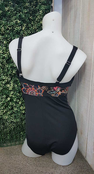 Flattering V crossover neckline with soft moulded cups for shape and support, ladder lace detail, wider adjustable straps for a comfortable fit and super flattering Baroque print detail. Fade and stretch resistant quick dry fabric! Suitable for A-D cups.