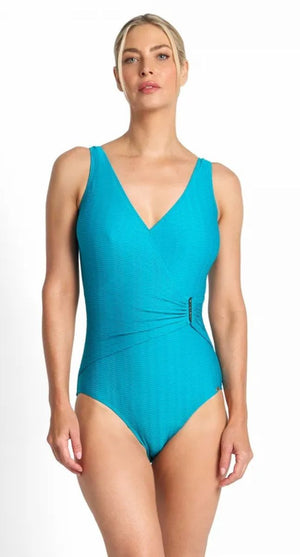 Dive into confidence with the Sky High Bar Surplice One Piece in Aqua, engineered with Janzten's innovative Trim Swim technology. This stunning style features strategic Powernet fabrication across the front to smooth and sculpt your silhouette while keeping you comfortable and supported. The fixed soft bra cups and elastic shelf bra provide gentle lift, while the mid-scoop back and crossover wrap front create a flattering, fashion-forward look. Lightweight, breathable mesh allows moisture to escape, so you stay dry and fabulous all day. Perfect for making waves at the beach or pool.