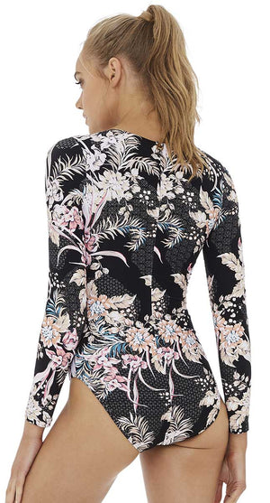 Fun in the sun! The Paloma long sleeve surf suit features sexy lace up front, contrast black panelling to visually nip the waist in and draw the eye up, soft moulded cups to shape the bust, UPF 50+ sun protection.