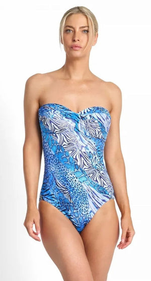 Dive into confidence with the Tigeress Twist Bandeau One Piece in Navy. This stunning swimsuit features strategic Powernet fabric across the front to smooth and sculpt your silhouette, while fixed moulded cups and side boning deliver a flattering fit. The signature twist front bra design adds a touch of flair, and removable convertible shoulder straps let you switch up your look. Regular pant cut keeps things classic and comfortable. Make waves in style.