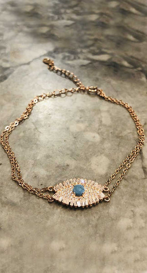 Aegeanblue Zakynthos bracelet-rose gold plated. Inspired by white beaches, impossible blue waters with plenty of soft and hard corals and plenty of sea turtles stamped 925 sterling silver a centre stone of blue turquoise surrounded by sparkling clear crystals set a double cable chain link chain 21cm in length including an extension chain of 5cm to complete this bracelet